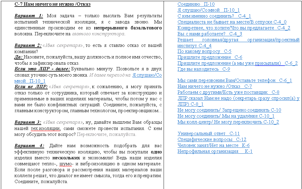 Услуга позволит Вам получить ЭФФЕКТИВНЫЙ сценарий за 3 недели. Эффективный сценарий позволит Вам в 2-3 дня готовить нового сотрудника для холодного обзвона. Избавит от необходимости долгого ожидания результатов «роста» специалиста, периодически отправляя такого сотрудника на тренинг. Сценарий будет содержать только конкретные фразы для проведения переговоров, организованные гиперссылками, так, чтобы позволить call-менеджеру просто читать текст для естественного ведения беседы по телефону.